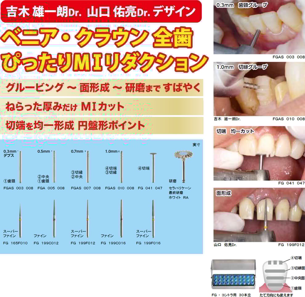 MI ガイドグルーブ 深さ0.3mm 1本 MI ガイドグルーブ 深さ0.5 〃 MI ガイドグルーブ 深さ0.7 〃 MI ガイドグルーブ 深さ1.0 〃 FG 41 特大型 1入 FG 165F010 大型 1入(スーパーファイン) FG 199C012 大型 1入(ファイン) FG 199F012 大型 1入(スーパーファイン) FG 199C016 大型 1入(ファイン) FG F1xLr 大型 1入(スーパーファイン) セラハリケーン 最終研磨 ホワイト RA 1入 FG・コントラ用 30本立 (合計11本入) |